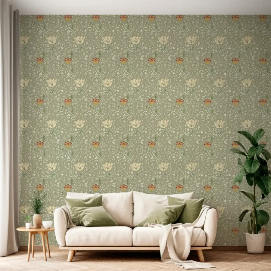Ons luxe behang met subtiel bloempatroon van de Engelse ontwerper/kunstenaar uit vervlogen tijden William Morris brengt een natuur en sfeer in je interieur. Het patroon met tulpen geeft een unieke en sfeervolle uitstraling aan elke ruimte. De subtiele groentinten geeft rust, maar is toch zeer charmant in elke kamer. Zeer mooi in de woonkamer, maar ook zeker in slaap- of werkkamer. Of wil je dit behang in de badkamer of keuken? Kies in dat geval voor ons naadloze behang met waterafstotende kwaliteiten!